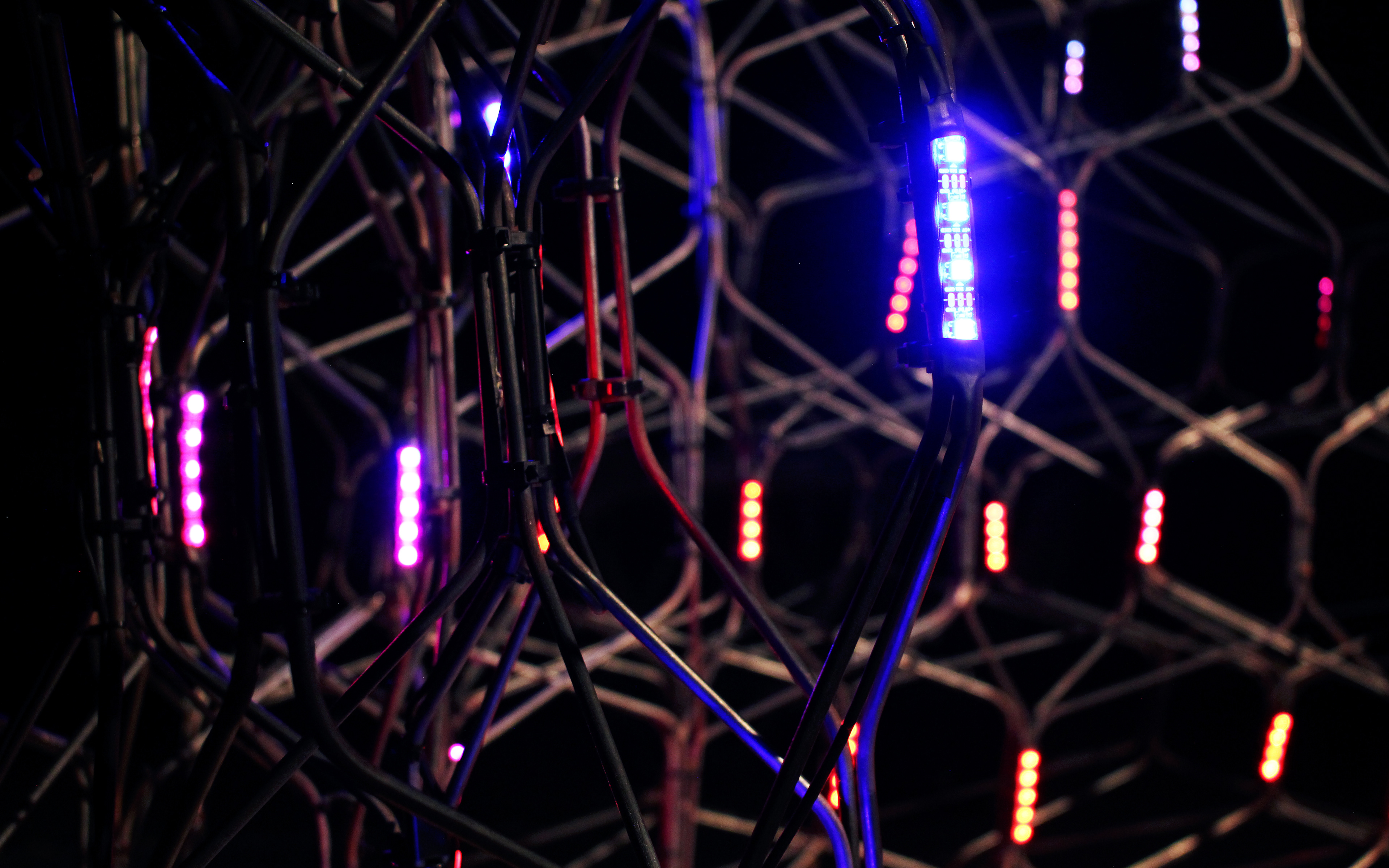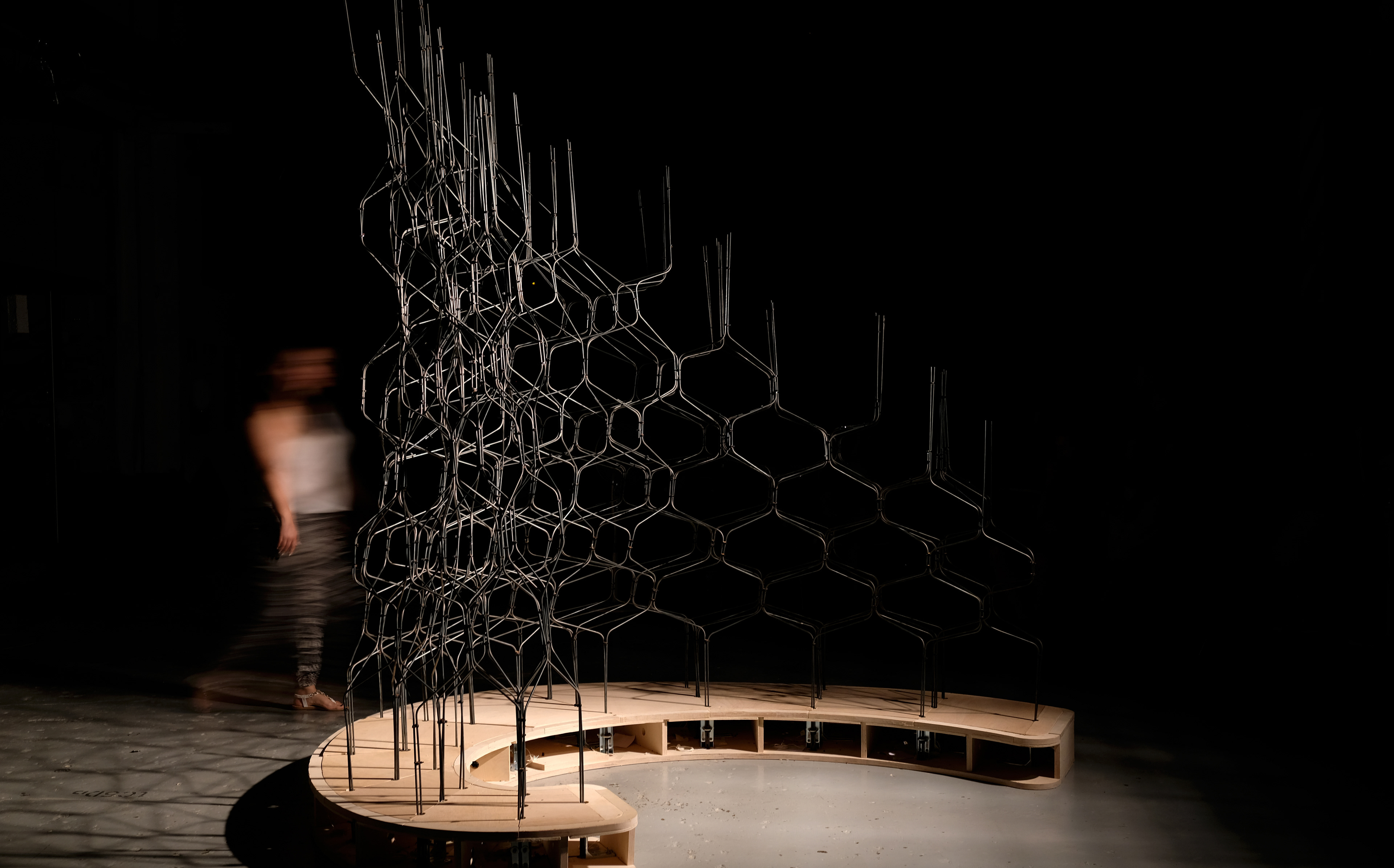 “Metallic Spaces” is a 1:1 scale architectural prototype generated through robotically bent steel rods. It conforms to a translucent structure embedded with conductive sensors, responding to touch.